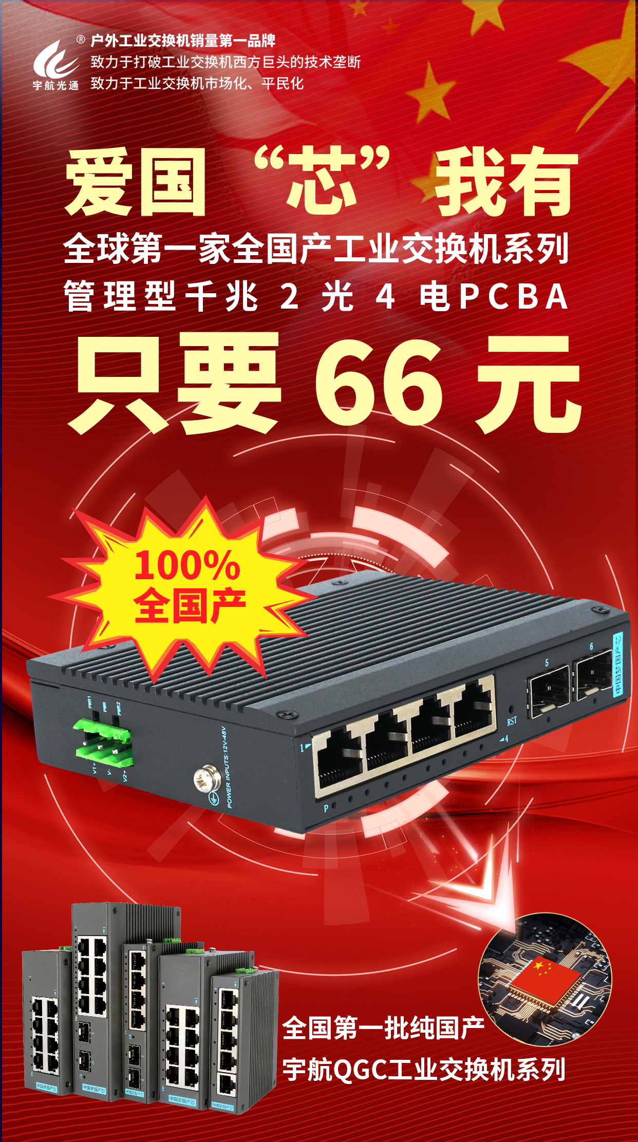 在2023深圳安博會期間,宇航展出了使用國產芯片的全國產管理型千兆2光4電工業級交換機。這是全球第一臺100%全國產工業級管理型交換機,價格僅售66元。這一創新性產品的推出,再次證明了宇航在工業通信領域的領先地位和卓越的技術實力。