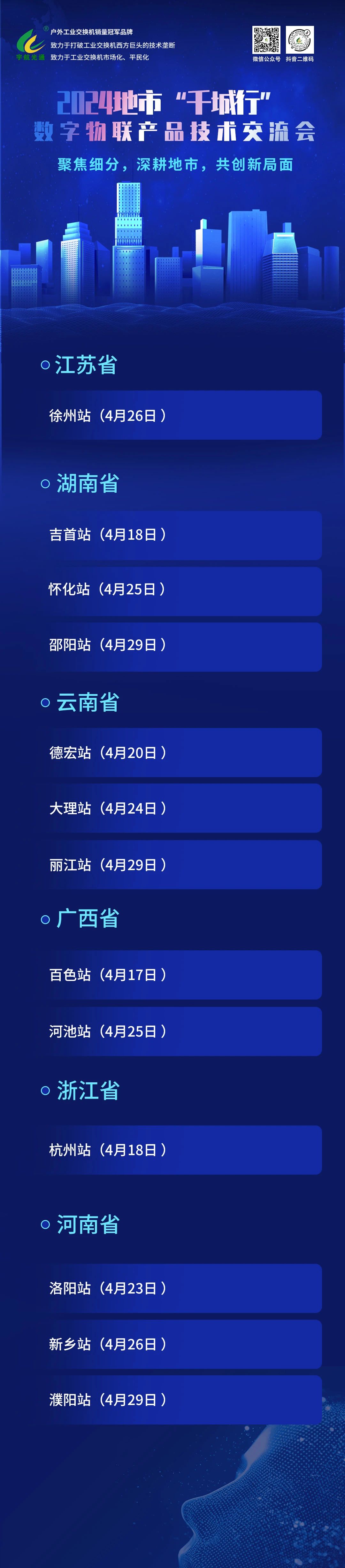 2024宇航工業(yè)交換機(jī)千城行產(chǎn)品技術(shù)交流大會(huì)正如火如荼地進(jìn)行中,4月1日至4月16日,宇航分別在福建漳州、云南臨滄/保山、江蘇徐州、湖南張家界、河南開封等地成功舉辦大會(huì)。