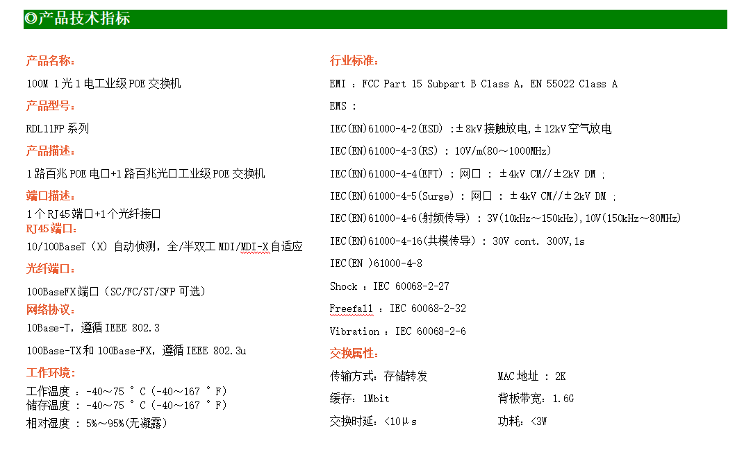1路百兆POE電口+1路百兆光口工業(yè)級(jí)以太網(wǎng)POE交換機(jī),支持1個(gè)10/100Base-TX電口和1個(gè)100Base-X(SC/ST/FC)光口。產(chǎn)品符合FCC、CE、ROHS標(biāo)準(zhǔn)。RDL11FP系列交換機(jī)具有-40℃~75℃的工作溫度,具有超強(qiáng)的堅(jiān)固度能適應(yīng)各種嚴(yán)苛環(huán)境,也可以非常方便的安置在空間緊湊的控制箱中。導(dǎo)軌的安裝特性、寬溫操作及擁有IP40防護(hù)等級(jí)的外殼及LED指示燈,使RDL11FP成為一個(gè)即插即用的工業(yè)級(jí)設(shè)備,為用戶的以太網(wǎng)設(shè)備聯(lián)網(wǎng)提供可靠、便捷的解決方案。