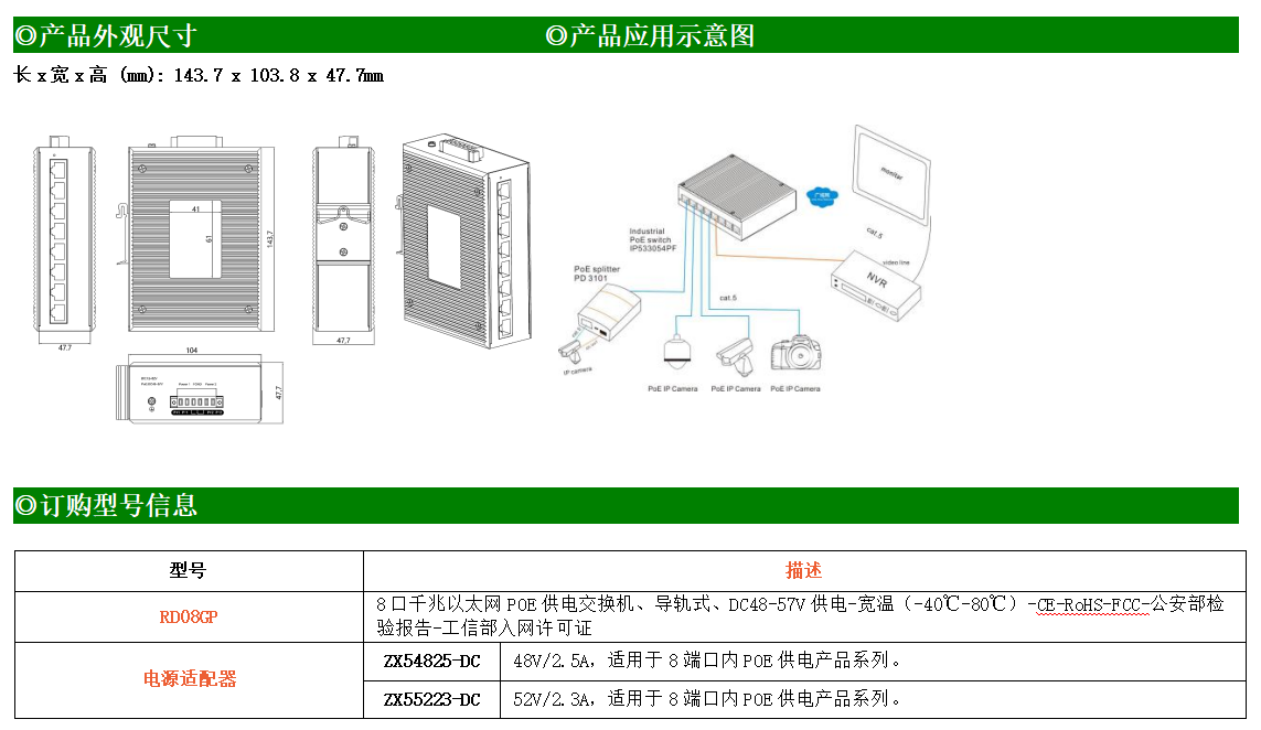 8路千兆電口工業級以太網POE交換機,支持8個100Base-T/1000Base-TX POE電口。產品符合FCC、CE、ROHS標準。RD08GP交換機具有-40℃~80℃的工作溫度,具有超強的堅固度能適應各種嚴苛環境,也可以非常方便的安置在空間緊湊的控制箱中。導軌的安裝特性、寬溫操作及擁有IP40防護等級的外殼及LED指示燈,使RD08GP成為一個即插即用的工業級設備,為用戶的以太網設備聯網提供可靠、便捷的解決方案。