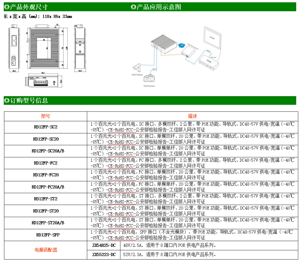 2路百兆POE電口+1路百兆SC光口工業(yè)級以太網(wǎng)POE交換機(jī),支持2個10/100Base-TX電口和1個100Base-X光口。產(chǎn)品符合FCC、CE、ROHS標(biāo)準(zhǔn)。RD12FP系列交換機(jī)具有-40℃~80℃的工作溫度,具有超強(qiáng)的堅固度能適應(yīng)各種嚴(yán)苛環(huán)境,也可以非常方便的安置在空間緊湊的控制箱中。導(dǎo)軌的安裝特性、寬溫操作及擁有IP40防護(hù)等級的外殼及LED指示燈,使RD12FP成為一個即插即用的工業(yè)級設(shè)備,為用戶的以太網(wǎng)設(shè)備聯(lián)網(wǎng)提供可靠、便捷的解決方案。
