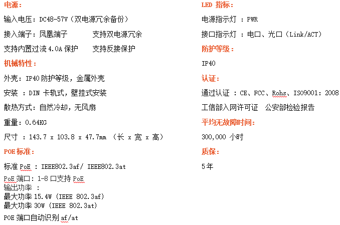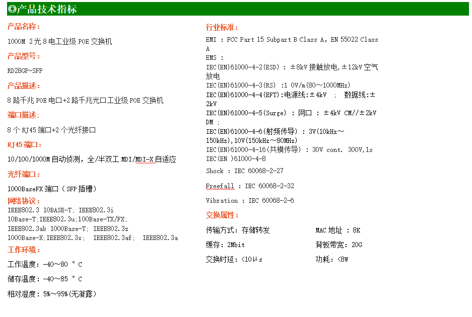 8路千兆POE電口+2路千兆FX光口工業(yè)級(jí)以太網(wǎng)POE交換機(jī),支持8個(gè)10/100/1000Base-TX電口和2個(gè)1000Base-X光口。產(chǎn)品符合FCC、CE、ROHS標(biāo)準(zhǔn)。RD28GP-SFP交換機(jī)具有-40℃~80℃的工作溫度,具有超強(qiáng)的堅(jiān)固度能適應(yīng)各種嚴(yán)苛環(huán)境,也可以非常方便的安置在空間緊湊的控制箱中。導(dǎo)軌的安裝特性、寬溫操作及擁有IP40防護(hù)等級(jí)的外殼及LED指示燈,使RD28GP-SFP成為一個(gè)即插即用的工業(yè)級(jí)設(shè)備,為用戶的以太網(wǎng)設(shè)備聯(lián)網(wǎng)提供可靠、便捷的解決方案。