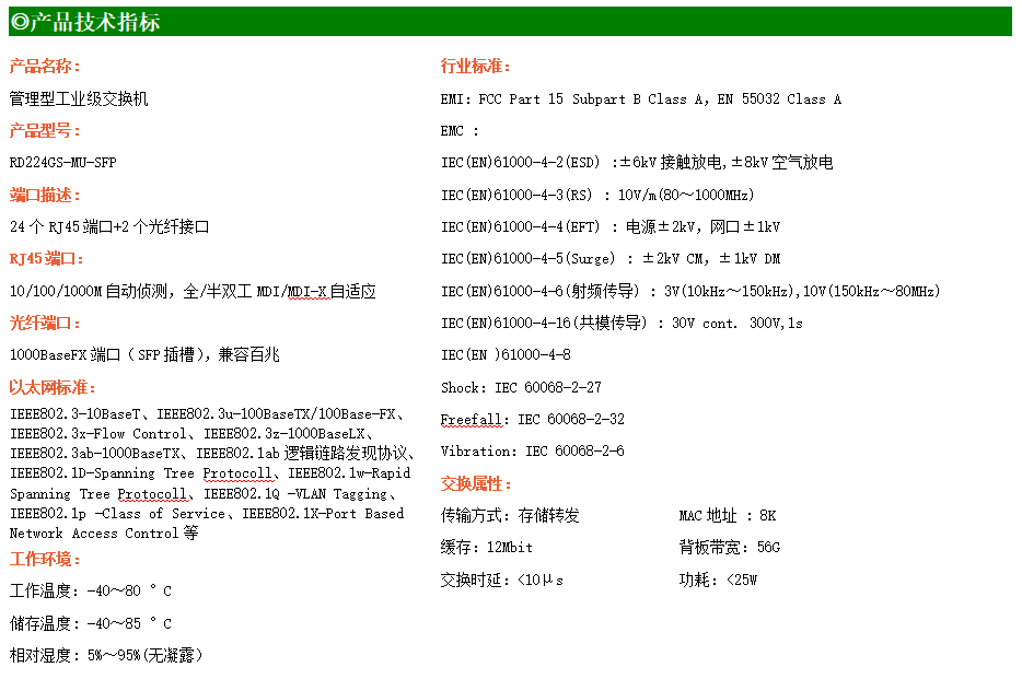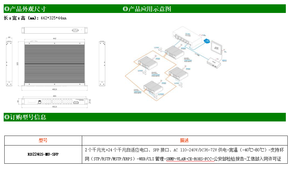 RD224GSP-MU-SFP是網管型工業(yè)以太網PoE交換機,產品符合FCC、CE、RoHS標準。可提供24個千兆PoE端口,所有PoE端口符合IEEE802.3af/at標準。支持工業(yè)現場所需的以太網二層協(xié)議,保證通信網絡的穩(wěn)定性;該系列交換機采用低功耗、無風扇設計,確保無噪聲干擾,同時支持-40~70℃工作溫度和良好的EMC電磁兼容性能,保證在惡劣的工業(yè)環(huán)境中保持穩(wěn)定的工作,為工廠自動化,智能交通,視頻監(jiān)控等工業(yè)應用領域組建快速穩(wěn)定的網絡終端接入網絡提供安全可靠的解決方案