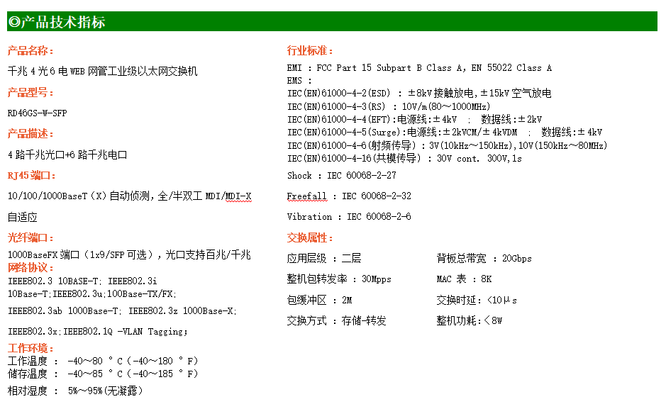 RD46GS-W系列WEB網管工業級以太網交換機,產品符合FCC、CE、ROHS標準,支持工業現場所需的以太網二層協議,保證通信網絡的穩定性。該系列交換機采用低功耗、無風扇設計,確保無噪聲干擾,同時支持-40~80℃工作溫度和良好的EMC電磁兼容性能,保證在惡劣的工業環境中保持穩定的工作,為工廠自動化,智能交通,視頻監控等工業應用領域組建快速穩定的網絡終端接入網絡提供安全可靠的解決方案。