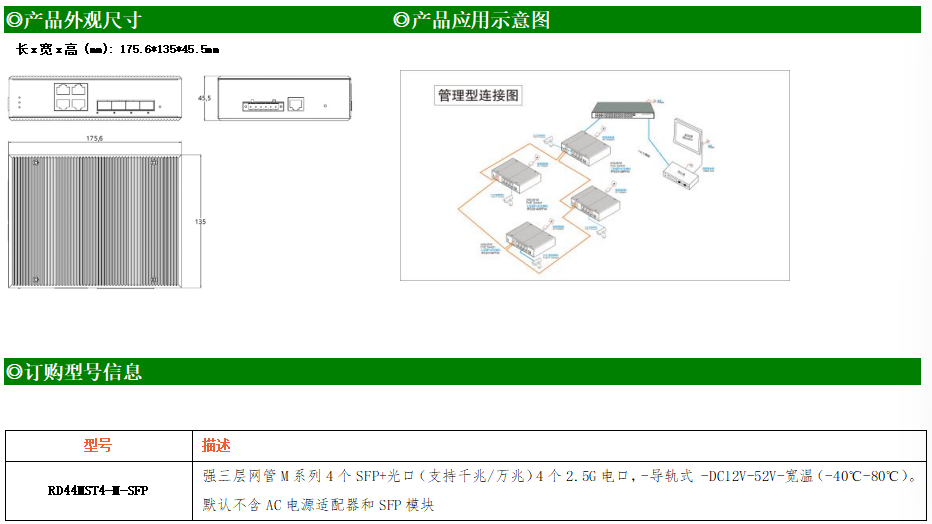 RD44MST4-M-SFP交換機(jī)是我司推出的一款萬兆三層交換機(jī),配備4個(gè)萬兆SFP+光口和4個(gè)10M/100M/1000M/2500M Base-T自適應(yīng)電口,具備先進(jìn)的硬件處理能力和最豐富的業(yè)務(wù)特性。支持IPv4/IPv6 硬件雙棧及線速轉(zhuǎn)發(fā),使客戶能夠從容應(yīng)對(duì)即將帶來的IPv6 時(shí)代其提供高容量的交換能力。RD44MST4-M-SFP交換機(jī)具有-40℃~80℃的工作溫度,具有超強(qiáng)的堅(jiān)固度能適應(yīng)各種嚴(yán)苛環(huán)境。導(dǎo)軌式安裝特性、寬溫操作,使RD44MST4-M-SFP的交換機(jī)成為一個(gè)即插即用的工業(yè)級(jí)設(shè)備,為用戶的以太網(wǎng)設(shè)備聯(lián)網(wǎng)提供可靠、便捷的解決方案。