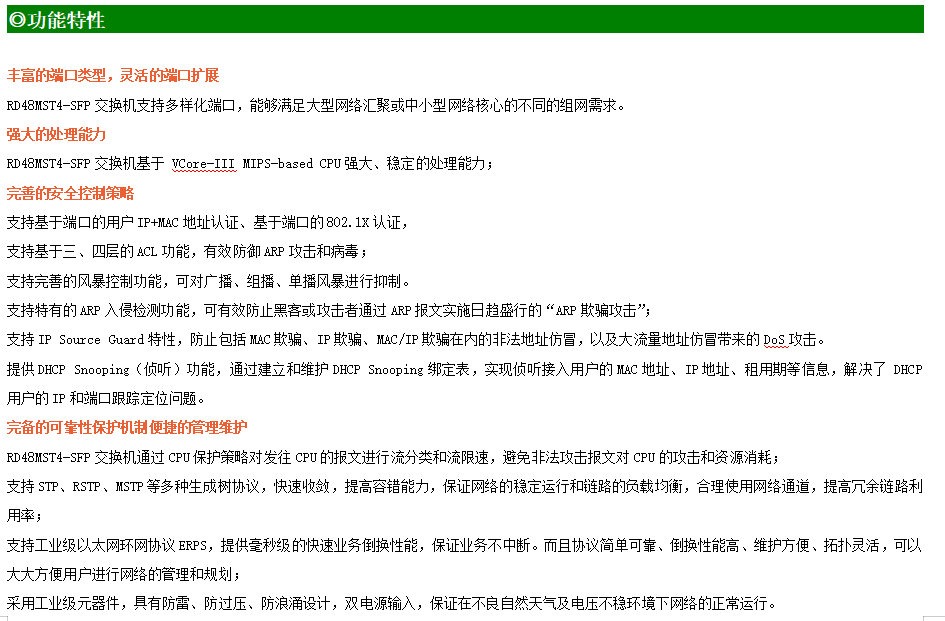 ●網(wǎng)絡(luò)冗余:支持STP/RSTP/MSTP,支持ERPS(自愈時(shí)間<20ms)